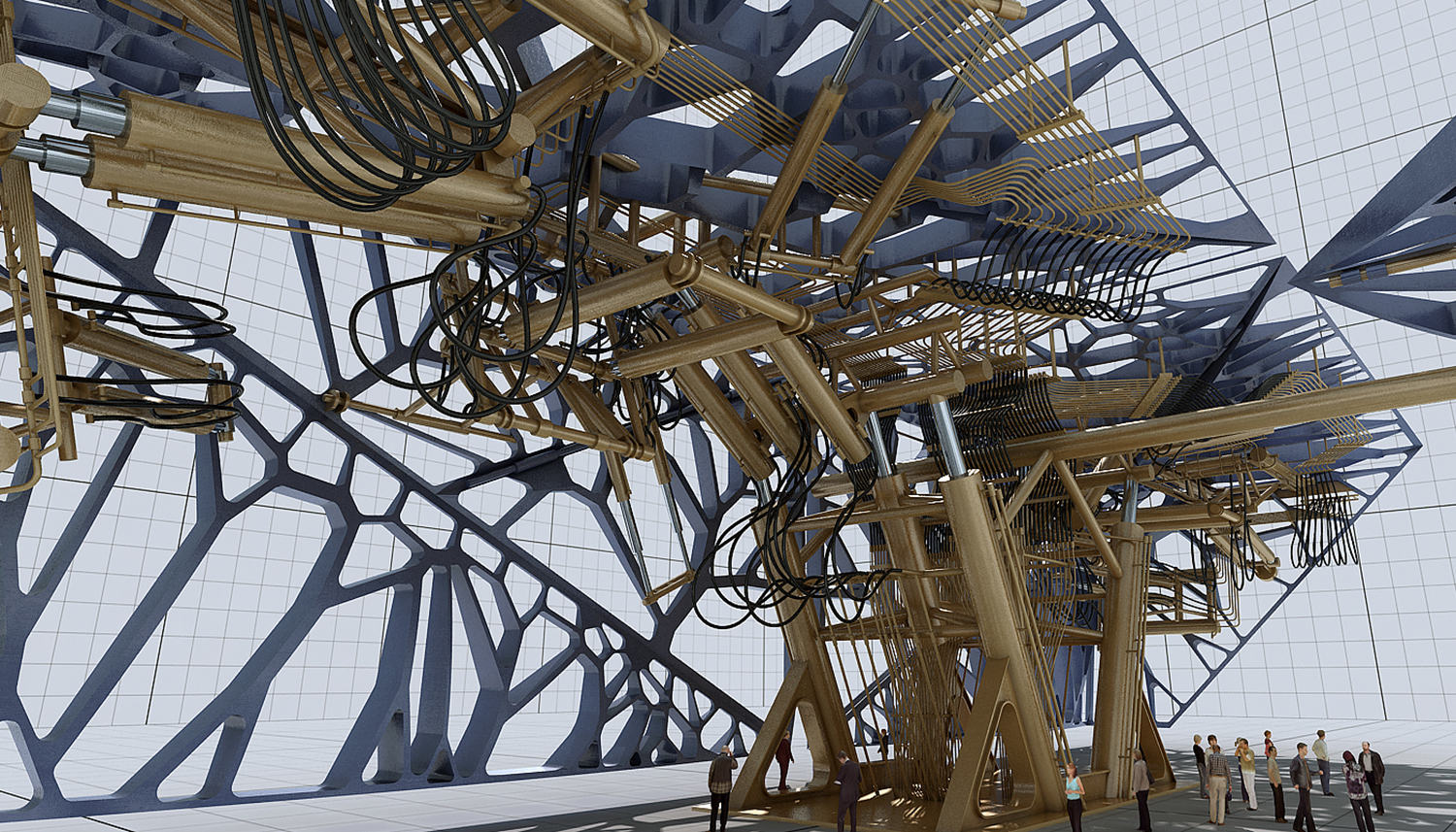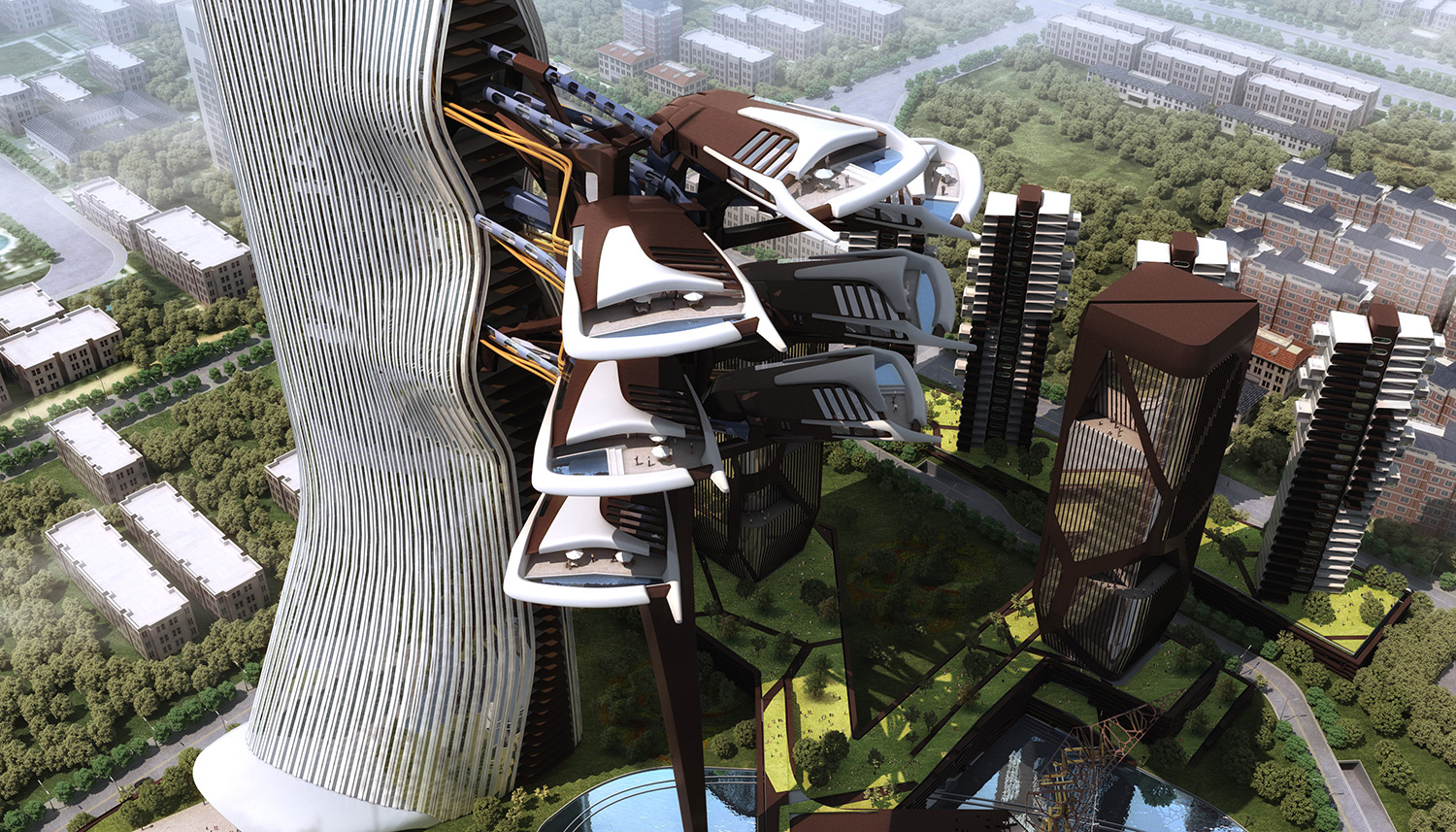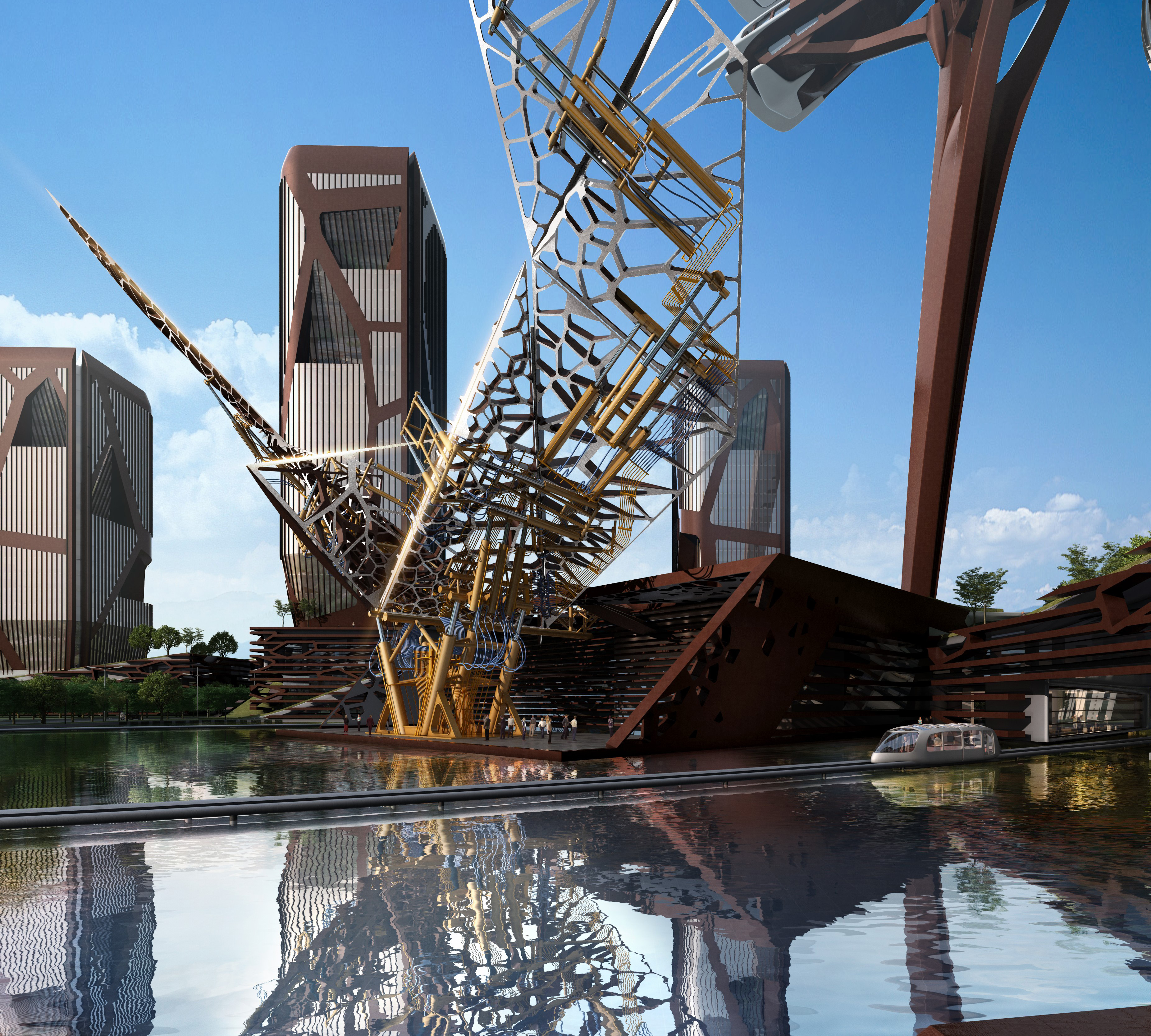 This scheme uses the multi-level and multi-center space layout strategy, achieving the goal of multi-function and multi-target. 280 m ultra high rise single tower as the highest point of the massing, the scheme proposes 5 towers of 80-100 m and a podium to form an enclosed space. The structure of the conference facilities falls back on the 199.2 m ultra-high tower, which represents the founding year of 1992 of Zoomlion. A water feature suspended at the vertical midpoint of the tower represents the spiritual and architectural center of the complex. The most visible feature in the scheme is the "seven spacecraft" - seven pods representing the seven founders of Zoomlion.