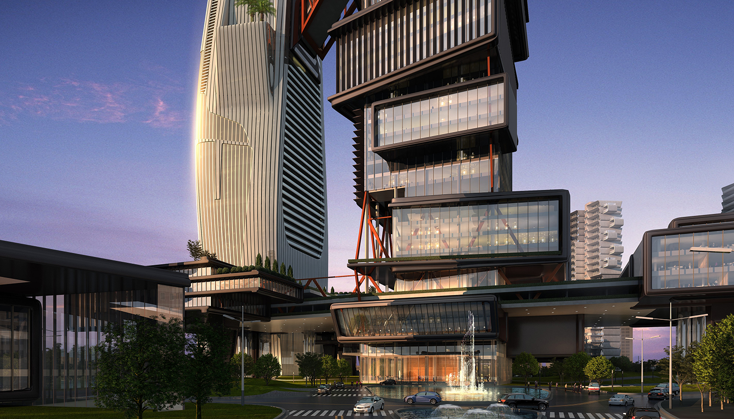 This scheme proposes twin towers to interpret the office and hotel as the two main functions of the program. The twin towers represent the idea of dualism. The office tower which is 199.2 m in height is the symbol of Zoomlion. The refined geometry of the 280 m hotel tower is contrasted with the rough texture of the office tower. The image is a vivid simulation of the space shuttle tied to its launching pad, emphasizing the industrial strength of Zoomlion product.
